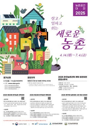 [중앙이코노미뉴스 엄현식] 농림축산식품부는 농촌소멸 위기에 대응하고, 지속 가능한 농촌 만들기에 대한 전 국민 관심도 제고를 위해 ‘농촌공간대전 2025’를 개최한다고 23일 밝혔다.농촌공간대전 2025의 금년도 공모 주제는 ‘국민 모두에게 열린 살고, 일하고, 쉬는 새로운 농촌’이며, 접수기간은 4월 14일부터 7월 4일까지다.이번 농촌공간대전은 ‘한국농촌건축대전’, ‘한국농촌계획대전’, ‘농촌경관 사진·영상 공모전’을 통합해 개최하며, 각 공모전을 통해 농촌 건축과 농촌 계획, 농촌 사진·영상 분야에서 참신한 아이디어를 발굴해