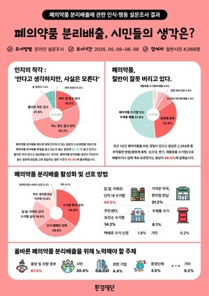 [중앙이코노미뉴스 엄현식] 환경재단(이사장 최열)은 지난 5월 9일부터 6월 8일까지 전국 시민 4,068명을 대상으로 실시한 ‘폐의약품 분리배출에 관한 인식∙행동 설문조사’ 결과를 발표했다고 29일 밝혔다.이번 조사는 환경재단과 의약품 운송 분야에서 핵심 역할을 하는 글로벌 물류기업 퀴네앤드나겔이 함께하는 ‘지구처방전’ 캠페인의 일환으로, 올바른 폐의약품 분리배출 문화를 조성하기 위해 기획됐다. 특히 폐의약품이 2017년 생활계 유해폐기물로 지정된 이후에도 수거율이 약 10%에 그치는 현실을 반영해, 일상 속 폐의약품 처리 실태를