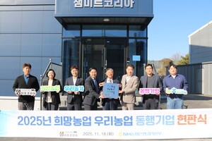 [중앙이코노미뉴스 김영철] NH농협은행 경기본부(본부장 김성록)는 18일 ㈜농업회사법인 '샘미트코리아(대표 박종필)'를 '희망농업 우리농가 동행기업'으로 선정하고, 화성시 정남면 본사를 방문해 현판식을 개최하며 상생 경영과 소통의 시간을 가졌다고 밝혔다.'희망농업 우리농가 동행기업'은 우리 농산물 사용 활성화와 지역 농가와의 상생 경영을 실천하는 우수 농식품 기업을 지원하는 농협은행의 프로젝트다.선정 기준은 매출액 대비 우리 농산물 구매금액이 10% 이상인 기업이며, 선정 기업에는 현판식 진행, 금융지원 우대, 판로 확대, 홍보 지