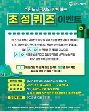[중앙이코노미뉴스 김영철] 수원도시공사(사장 이영인)는 ESG 경영 선도 일환으로 기후변화 대응과 관련한 SNS 이벤트를 실시한다고 24일 밝혔다.SNS 이벤트는 기후변화와 관련된 문장에서 '초성'을 맞추는 방식으로, 정답을 댓글로 남기면 된다.이벤트 문항은 '최근 전 세계적인 기후변화 대응 및 지속가능한 발전 목표에 부합하는 ESG 경영의 중요한 요소는 에너지 산업의 변화를 이끄는 것입니다. 특히 XX는 환경에 큰 영향을 미치므로 XX사용을 효율적이고 친환경적으로 바꾸려는 노력은 ESG 경영의 핵심 과제입니다.'이다.다음달 3일까