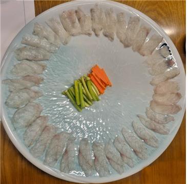 복어회는 얇게 썰어내는 것이 기술이다. 얼굴에 대면 비칠 정도이고 접시에 깔아 놓으면 접시 색깔이 오롯이 비치는 두께이다. 생복어 살은 단단하고 질기기 때문에 되도록 얇게 해야 좋은 식감을 느낄 수 있으며 조금만 두꺼워도 질겨서 회 맛이 떨어진다. 이런 이유로 접시도 모양이 크고 색깔이 아름다워야 눈으로 먹는 2차 즐거움이 있어 그림이 멋진 수제품의 접시를 쓰며 복어회를 전문으로 하는 집은 접시 자체가 남다른 것을 알 수 있다.