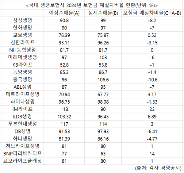 3일 국내 22개 생보사의 '2024년 결산공시'를 분석한 결과 보험금 예실차비율을 공시한 21개 생보사 중 9곳이 금감원 권고치(±5% 내외)를 맞추지 못했다.