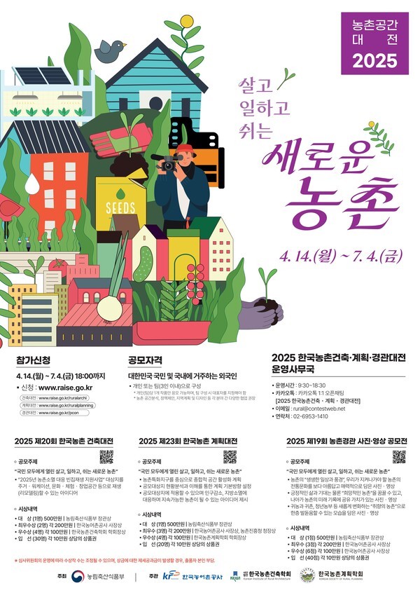 농촌공간대전 2025의 금년도 공모 주제는 ‘국민 모두에게 열린 살고, 일하고, 쉬는 새로운 농촌’이며, 접수기간은 4월 14일부터 7월 4일까지다.