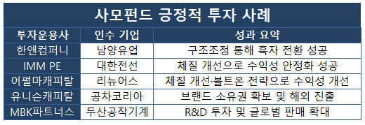 실제 한앤컴퍼니, MBK파트너스, IMM인베스트먼트, 스틱인베스트먼트, 유니슨캐피탈코리아, 어펄마캐피탈 등 주요 사모펀드 운용사들은 전통 제조업부터 식음료·환경 분야까지 다양한 분야에서 의미 있는 투자 성과를 거두며 장기적 관점의 경영 전략을 입증해온 사례들이 존재한다.