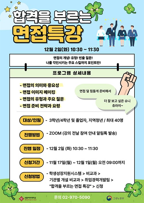 이러한 실전 중심 지원 체계를 기반으로, 오는 12월 2025년 2학기 진로·취업 역량 강화 프로그램 ‘합격을 부르는 면접 특강’을 진행할 계획이다. 이번 특강은 기업의 면접 방식이 세분화되고 평가 기준이 고도화되는 흐름에 따라 참여자들이 면접 핵심 질문에 대한 전략적 사고를 기르고, 개인의 강점을 구조화해 표현할 수 있도록 돕기 위해 마련됐다.